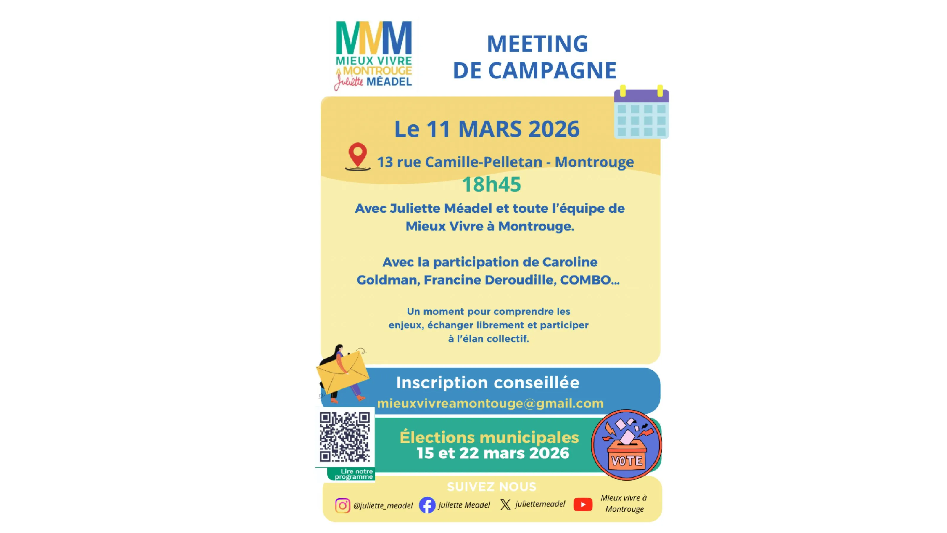 Venez participer au meeting de campagne de Mieux Vivre à Montrouge, et rencontrer Juliette Méadel et son équipe.